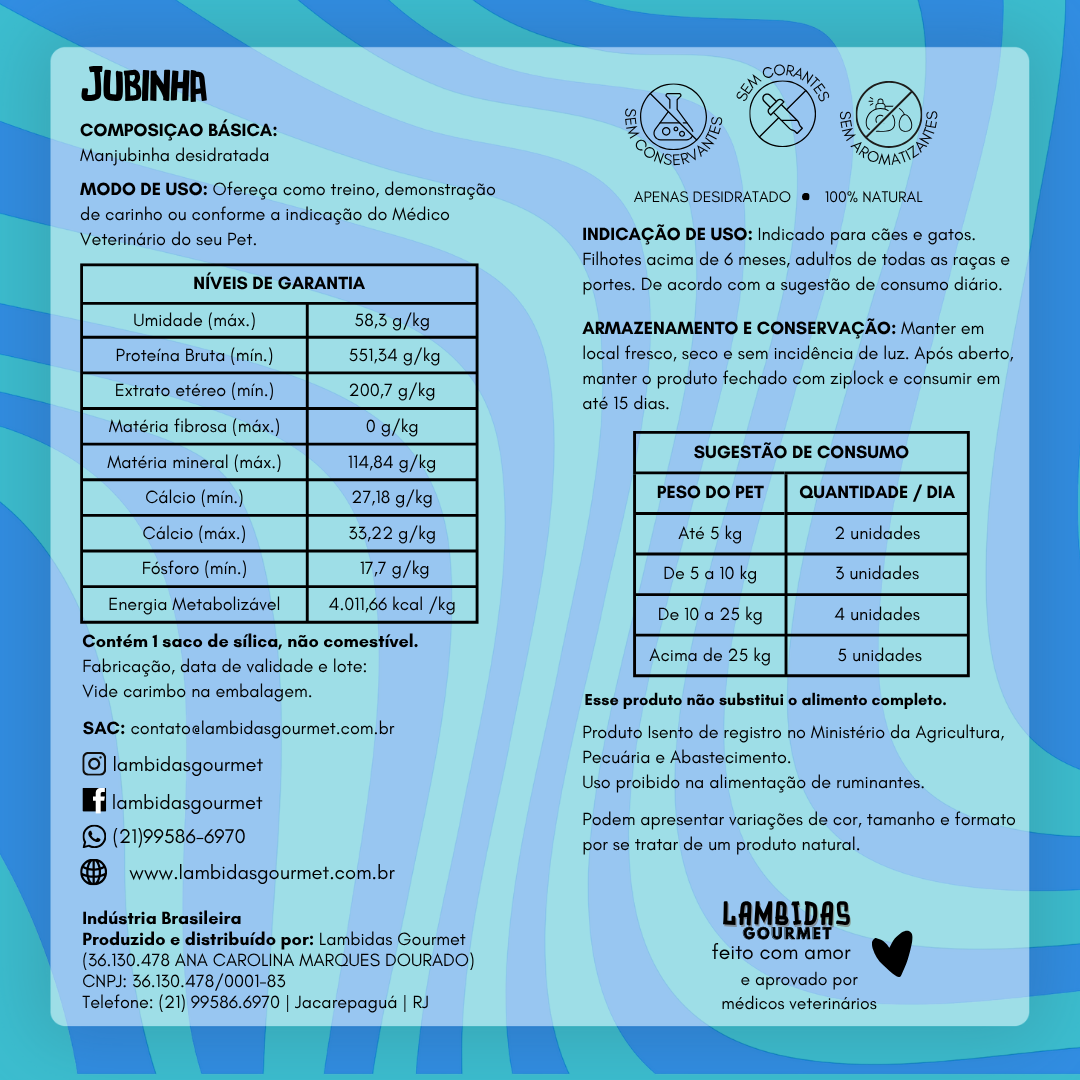 Nossa Manjubinha Desidratada (ou Jubinha, como prefere ser chamada) é um petisco natural, irresistível e nutritivo, ideal para cães e gatos! Produzida com peixes frescos e selecionados, essa delícia é 100% natural, sem conservantes, corantes ou aditivos artificiais. Rica em proteínas e ácidos graxos essenciais como ômega 3 e 6, ela contribui para a saúde da pele, pelagem brilhante e um sistema imunológico mais forte.