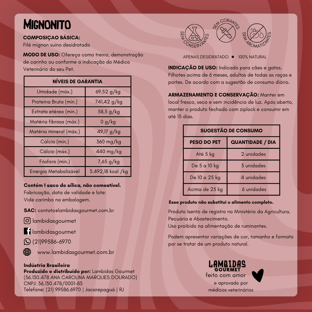 O Mignon Suíno Desidratado (o nosso querido Mignonito) é um petisco premium, natural e nutritivo, feito a partir de carne de filé mignon suíno selecionada e desidratada, sem adição de conservantes ou aditivos artificiais. Rico em proteínas de alta qualidade e com baixo teor de gordura, é uma escolha saudável que promove a manutenção muscular do seu pet. Seu sabor irresistível agrada tanto cães quanto gatos, sendo ideal para pets de todas as idades e portes.